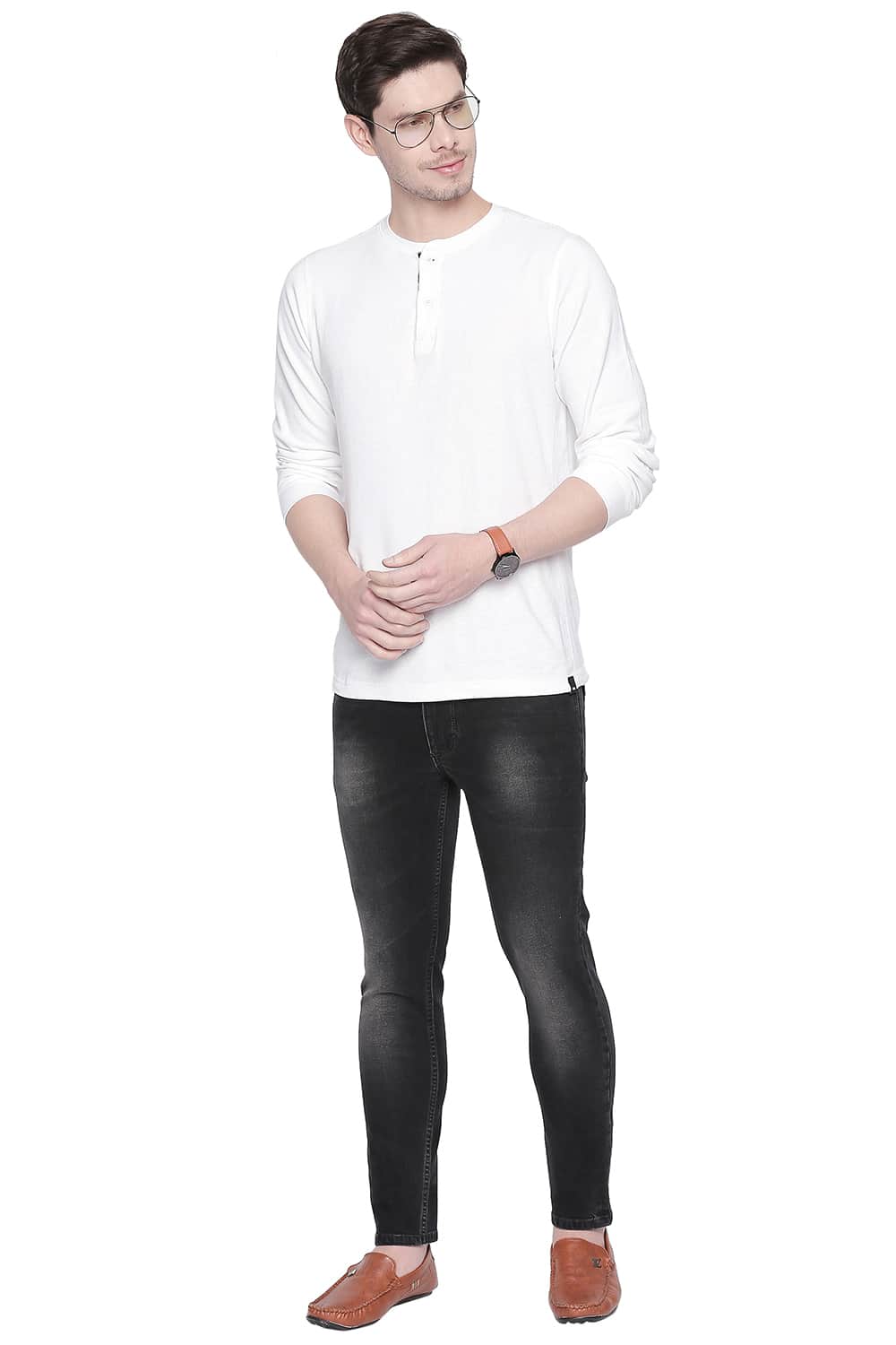 These right hand twill weave super skinny fit jeans from Basics latest menswear collection are just what summer needs. Comfortable thanks to its stretch blend, these tapered leg jeans have classic five pockets, stylized fly stitch and classic belt loops. Complete with a cool mid stone wash, mild whiskering and a faded look with hand sanding, these jeans look good with shirts and tshirts.