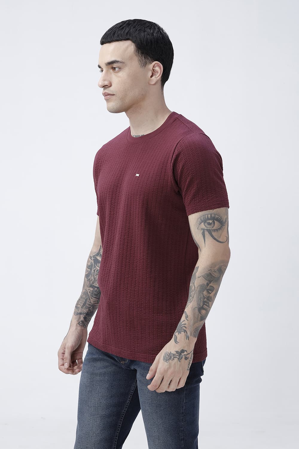 Regular Fit Cotton Crew T-Shirt Built for everyday versatilityclean lines, balanced proportions, and effortless wear. A minimal surface keeps styling simple and premium. Crafted in 100% Cotton for a comfortable handfeel and reliable drape. Finished with a crew neck for a neat, modern look. Available in maroon, navyeasy tones for weekday and weekend rotation. Style it open over a tee or buttoned and tuckedeither way, it works across office hours and off-duty plans.