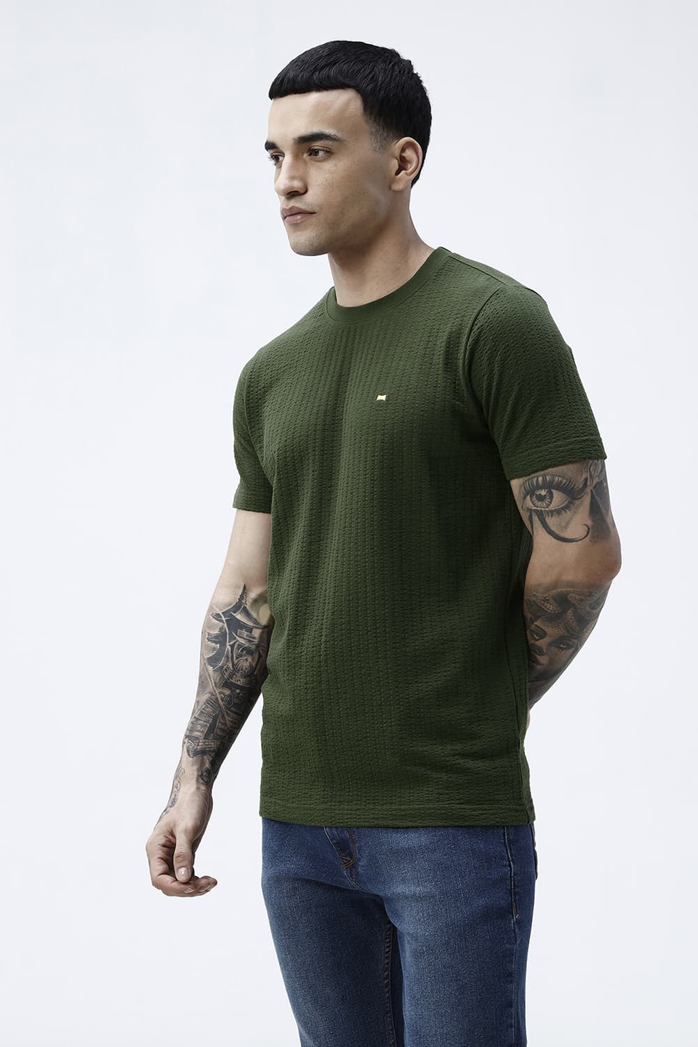 Regular Fit Cotton Crew T-Shirt Built for everyday versatilityclean lines, balanced proportions, and effortless wear. A minimal surface keeps styling simple and premium. Crafted in 100% Cotton for a comfortable handfeel and reliable drape. Finished with a crew neck for a neat, modern look. Available in green, mid greyeasy tones for weekday and weekend rotation. Style it open over a tee or buttoned and tuckedeither way, it works across office hours and off-duty plans.