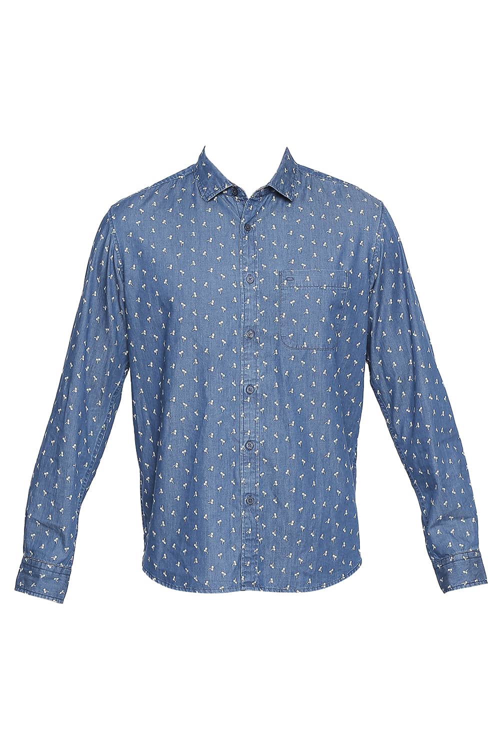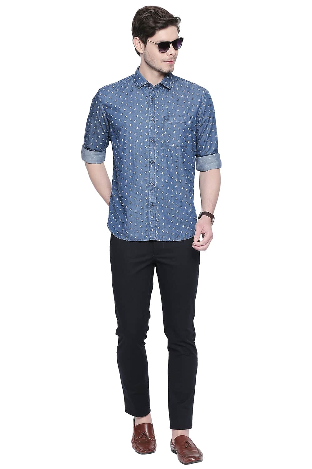 Stand tall in style with this cool palm tree print indigo twill chambray shirt from the latest menswear collection of clothing by Basics. Complete with signature details from the brand this summer shirt is apt for casual events when teamed with denims or chinos.Darts in the back give a tailored fit to the shirt while a stylized loop on the back yoke finishes it.