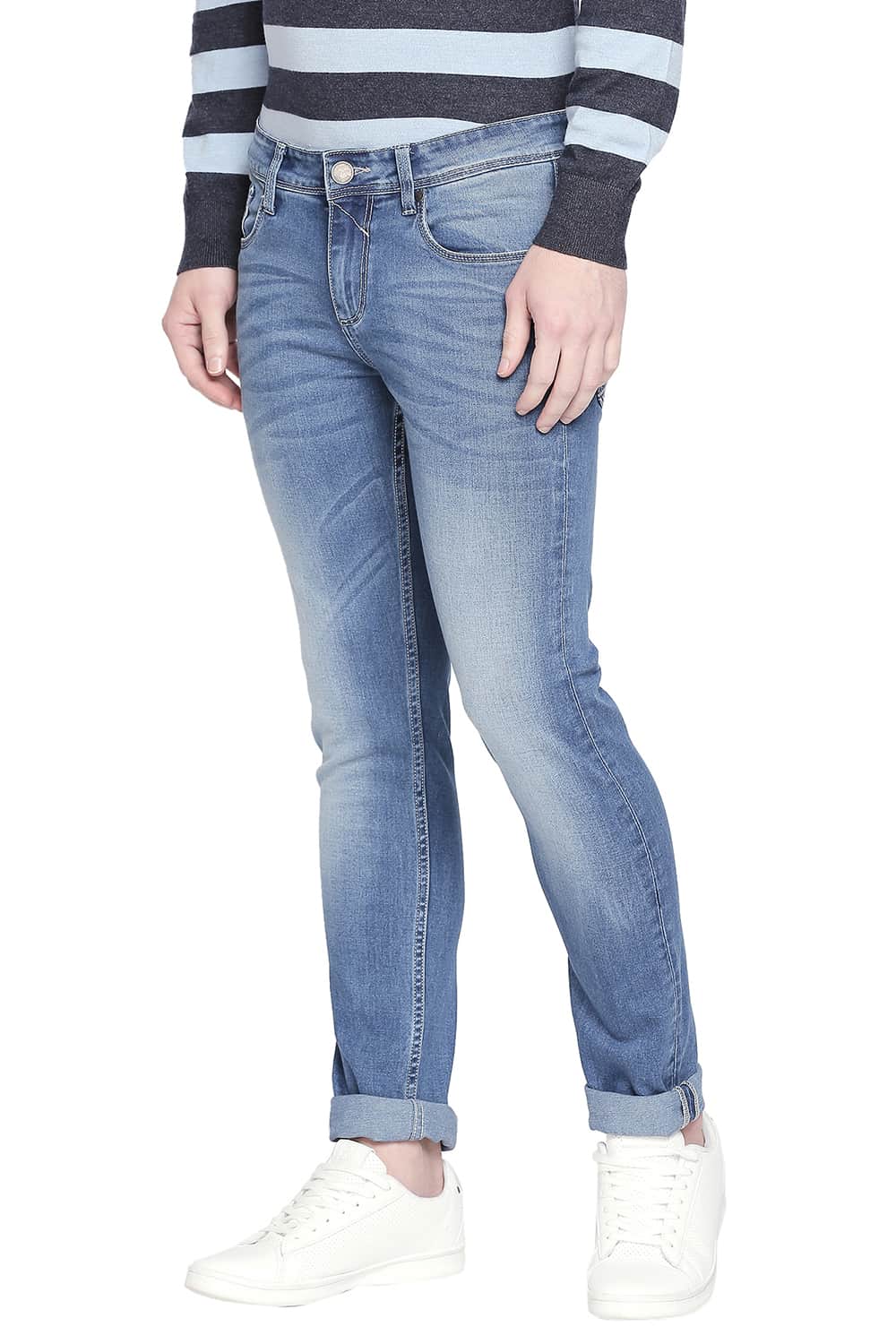 Get out of the ordinary and into a pair of Basics stretch blend drill weave jeans for the new age man. This all day comfort, skinny fit, narrow leg pair of jeans in a faded look pairs well with tshirts and formal shirts too. Complete with five pockets, stylized fly stitch and classic belt loops, the mid stone wash jeans with mild whiskering make a great summer choice.